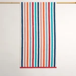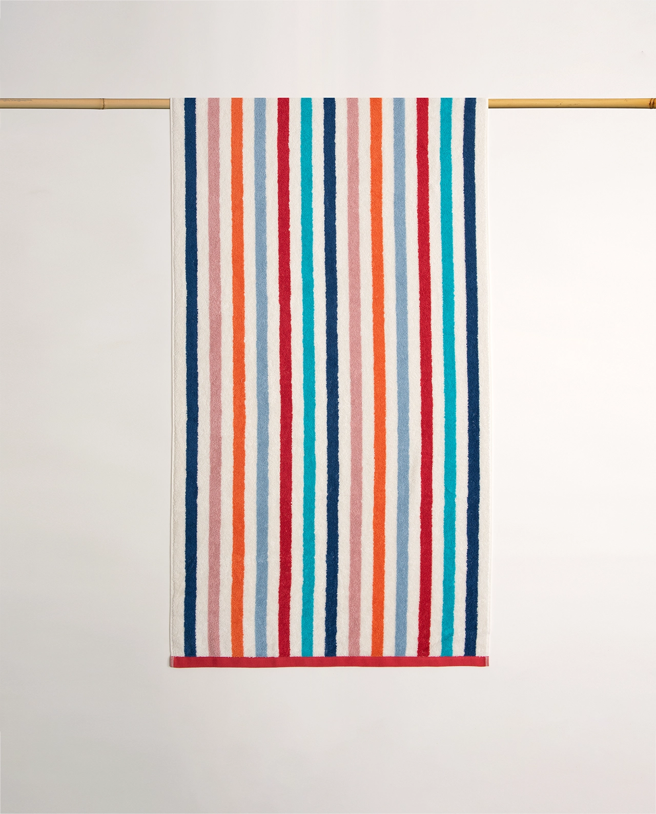 Cotton beach towel, lightweight, soft, and highly absorbent. The multicolour striped pattern pairs easily with different summer styles.