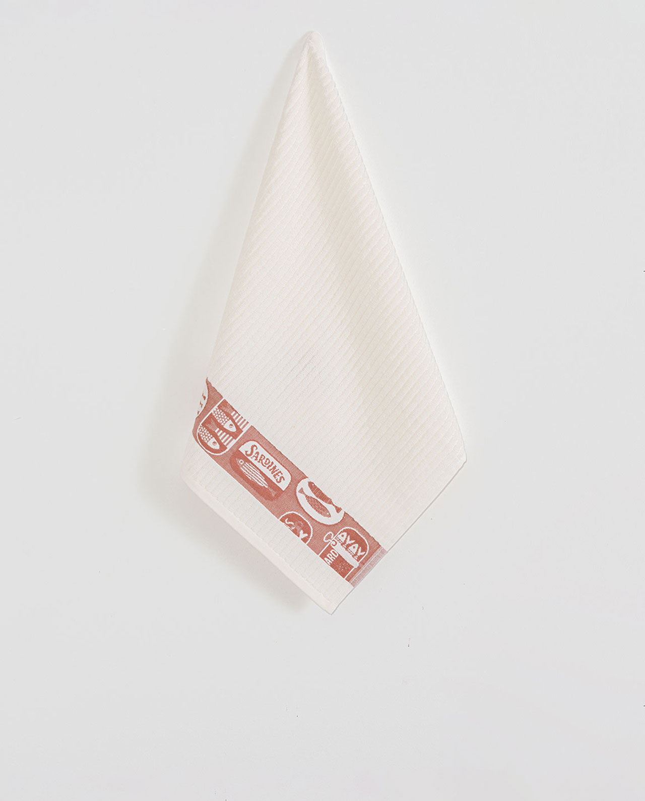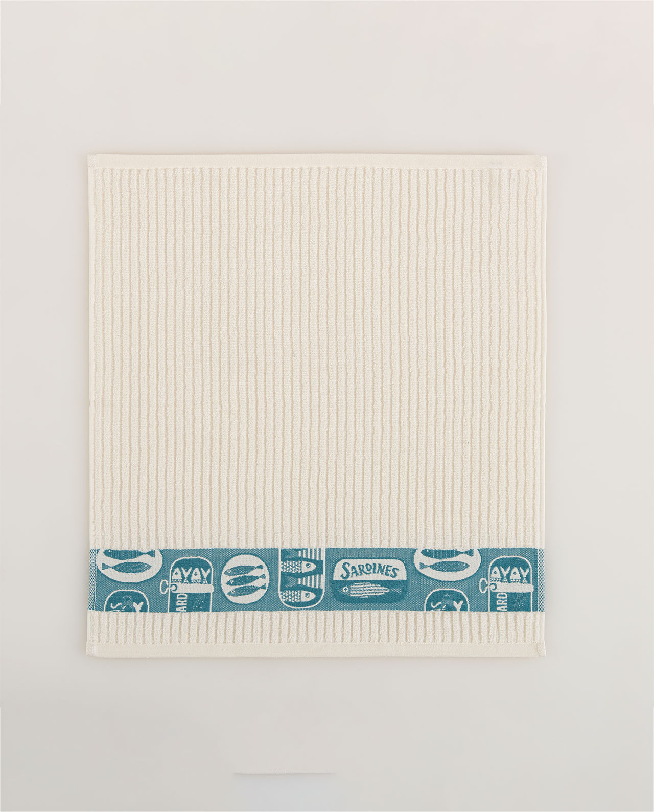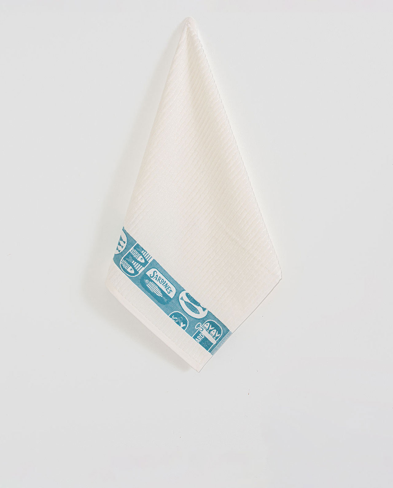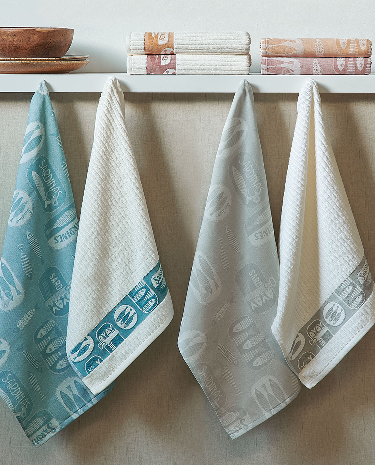 O novo pano de cozinha de felpo Sardinhas com motivos de peixe. Disponível em 4 cores. 100% algodão.