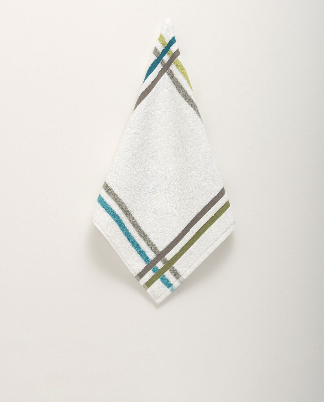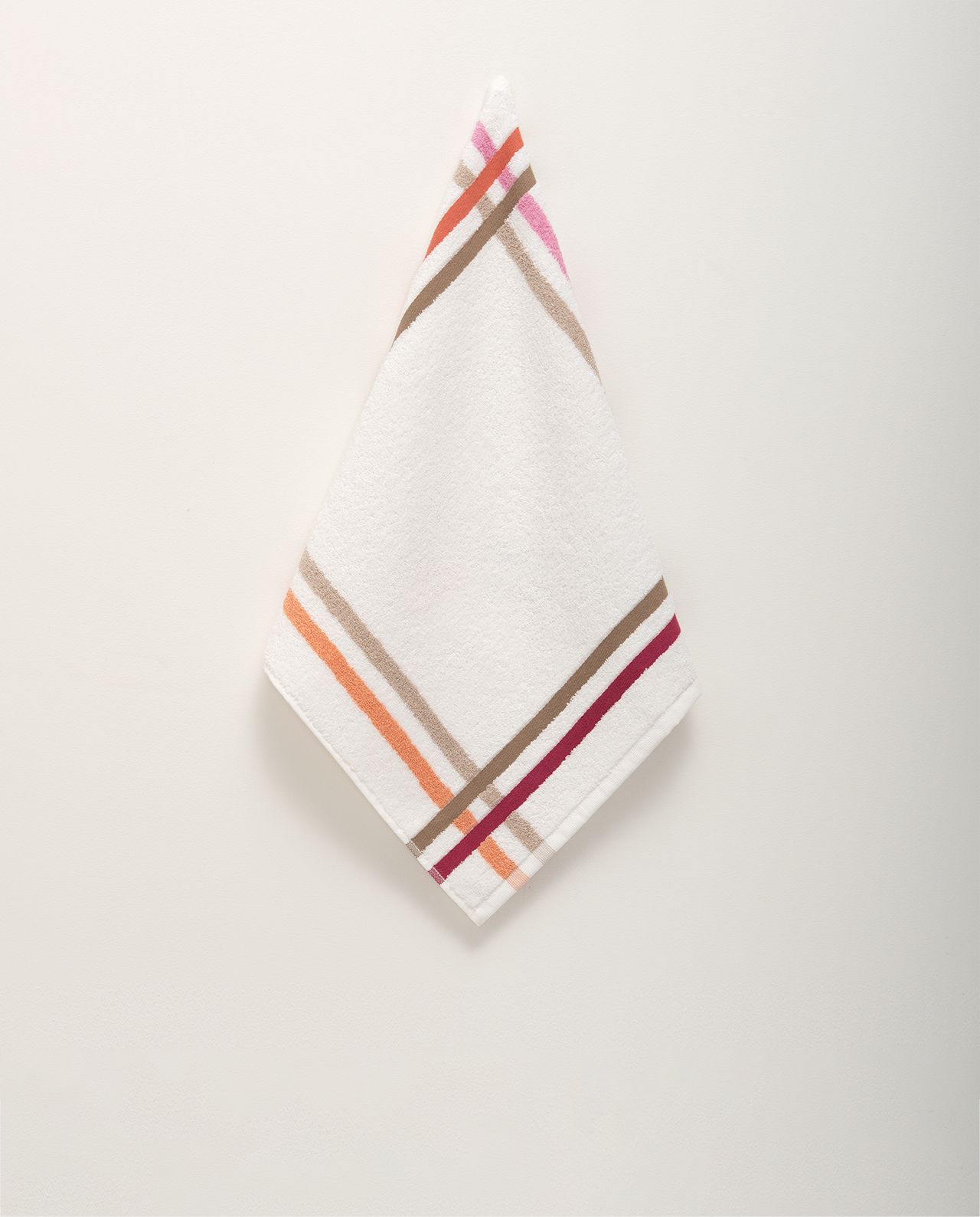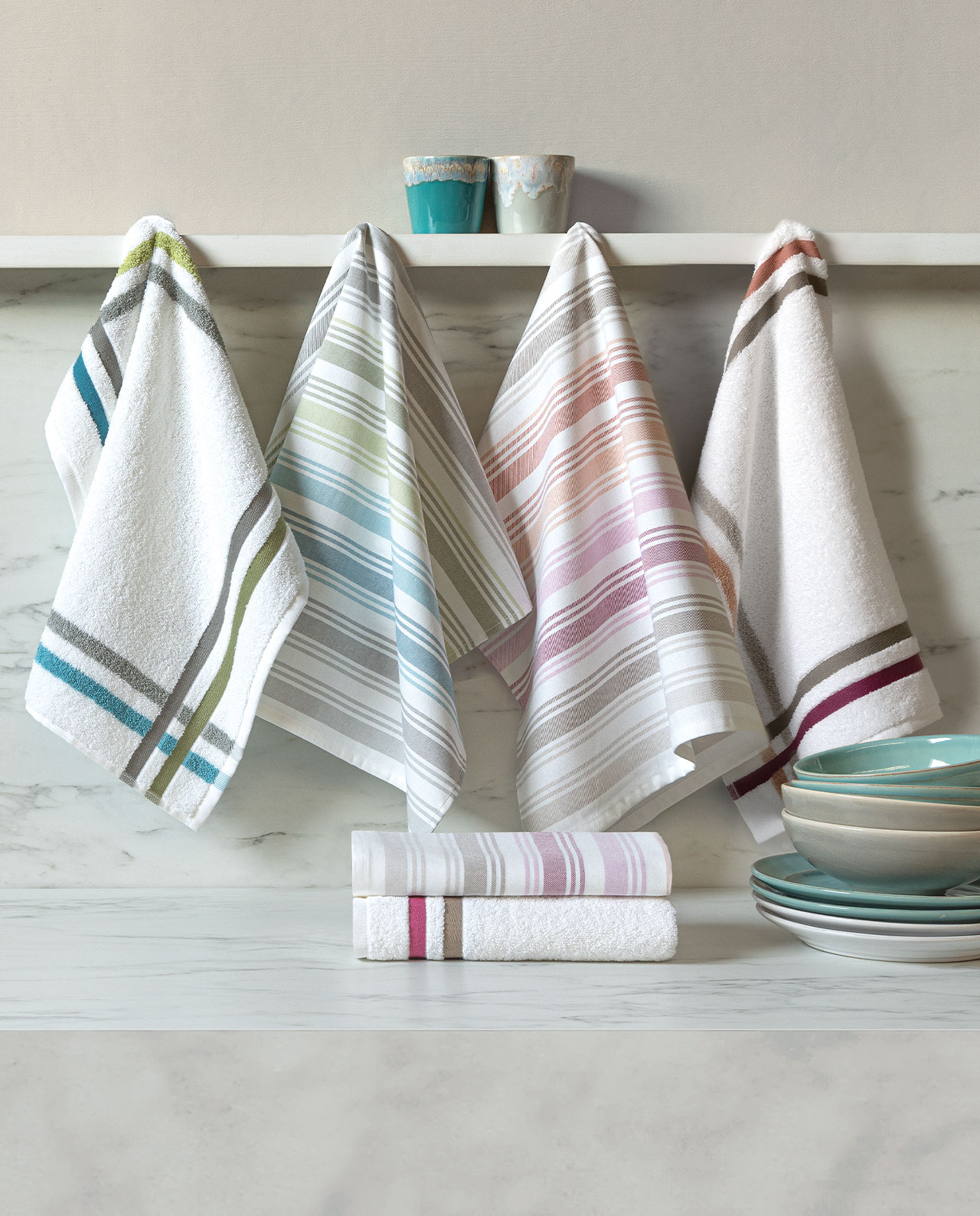 Pano de cozinha 50×50 cm em felpo de algodão, com padrão de riscas coloridas sobre fundo branco. Macio, absorvente e perfeito para dar um toque moderno à sua cozinha.