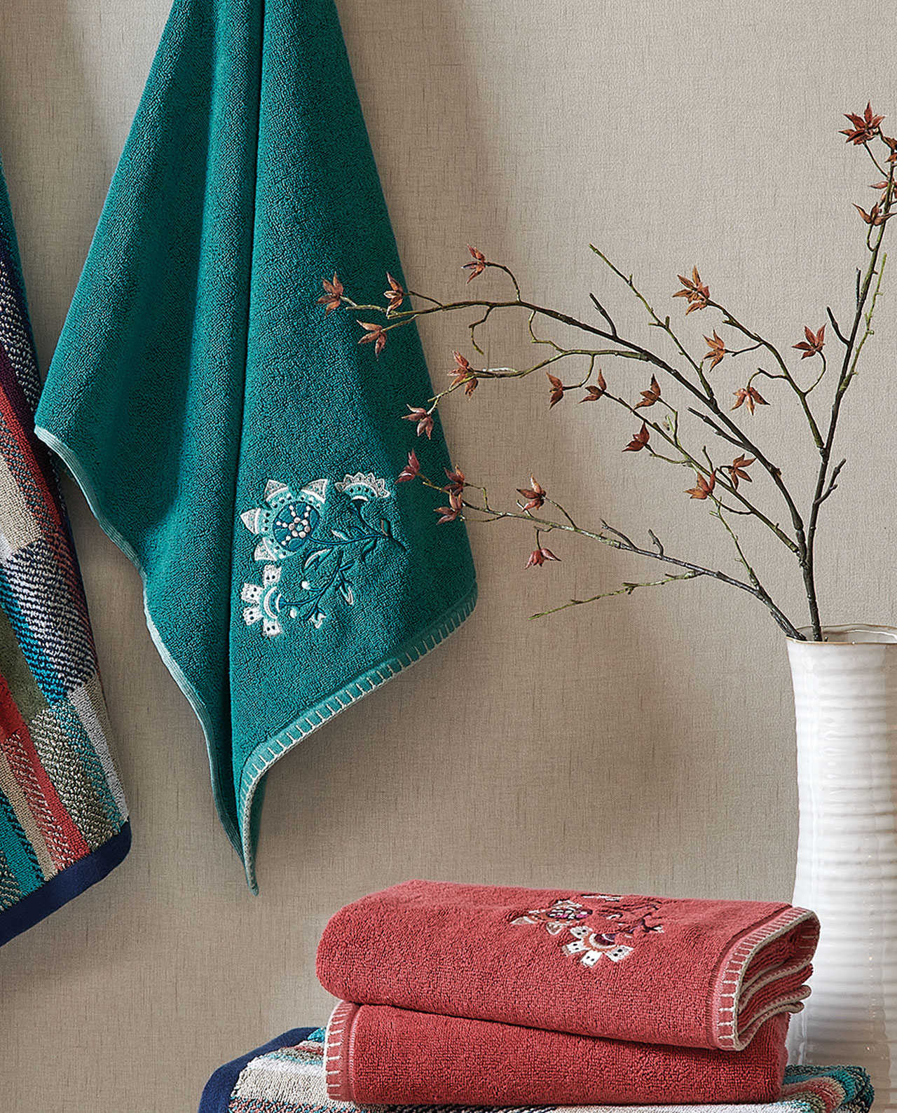 Toalha de banho retro com bordado tradicional. Simulação de ponto de cobertor na bainha.
